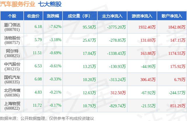 个股表现方面,汽车服务行业当日领跌股为厦门信达(000701),该股当日报收6.18,下跌7.62%,成交量95.58万,主力资金净流出3775.2万元。浩物股份(000757)以下跌3.18%紧随其后,该股当日成交量25.67万,主力资金净流出278.85万元。除此之外,阿尔特(300825)、中汽股份(301215)、国机汽车(600335)均进入当日熊股之列。具体个股列表见下表: