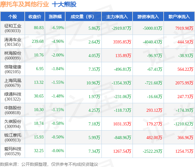 个股表现方面,摩托车及其他行业当日领跌股为征和工业(003033),该股当日报收80.83,下跌6.59%,成交量5.86万,主力资金净流出2919.87万元。涛涛车业(301345)以下跌4.96%紧随其后,该股当日成交量2.64万,主力资金净流入3595.85万元。除此之外,林海股份(600099)、信隆健康(002105)、上海凤凰(600679)均进入当日熊股之列。具体个股列表见下表: