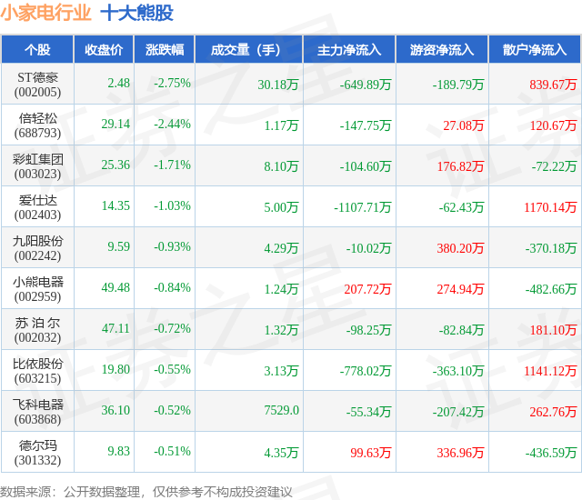 个股表现方面,小家电行业当日领跌股为ST德豪(002005),该股当日报收2.48,下跌2.75%,成交量30.18万,主力资金净流出649.89万元。倍轻松(688793)以下跌2.44%紧随其后,该股当日成交量1.17万,主力资金净流出147.75万元。除此之外,彩虹集团(003023)、爱仕达(002403)、九阳股份(002242)均进入当日熊股之列。具体个股列表见下表: