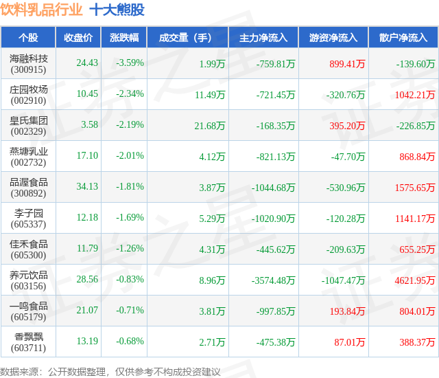 个股表现方面,饮料乳品行业当日领跌股为海融科技(300915),该股当日报收24.43,下跌3.59%,成交量1.99万,主力资金净流出759.81万元。庄园牧场(002910)以下跌2.34%紧随其后,该股当日成交量11.49万,主力资金净流出721.45万元。除此之外,皇氏集团(002329)、燕塘乳业(002732)、品渥食品(300892)均进入当日熊股之列。具体个股列表见下表: