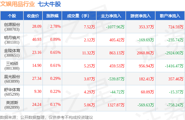 个股表现方面,文娱用品行业当日领涨股为创源股份(300703),该股当日报收28.09,上涨2.78%,成交量7.52万,主力资金净流出1077.96万元。明月镜片(301101)以上涨0.89%紧随其后,该股当日成交量2.12万,主力资金净流入405.42万元。除此之外,金陵体育(300651)、三柏硕(001300)、晨光股份(603899)均进入当日牛股之列。具体个股列表见下表: