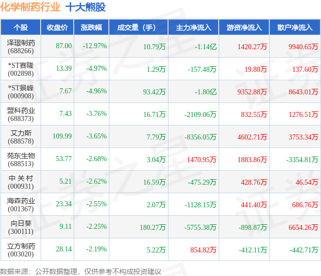 个股表现方面,化学制药行业当日领跌股为泽璟制药(688266),该股当日报收87.0,下跌12.97%,成交量10.79万,主力资金净流出1.14亿元。*ST赛隆(002898)以下跌4.97%紧随其后,该股当日成交量1.29万,主力资金净流出157.48万元。除此之外,*ST景峰(000908)、盟科药业(688373)、艾力斯(688578)均进入当日熊股之列。具体个股列表见下表: