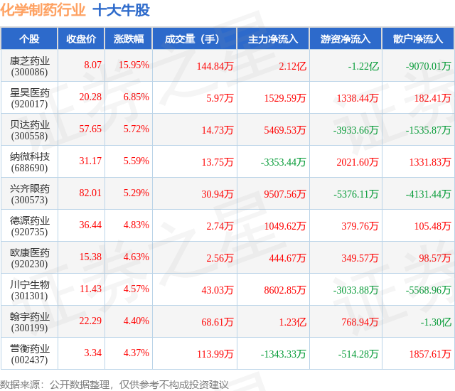 个股表现方面,化学制药行业当日领涨股为康芝药业(300086),该股当日报收8.07,上涨15.95%,成交量144.84万,主力资金净流入2.12亿元。星昊医药(920017)以上涨6.85%紧随其后,该股当日成交量5.97万,主力资金净流入1529.59万元。除此之外,贝达药业(300558)、纳微科技(688690)、兴齐眼药(300573)均进入当日牛股之列。具体个股列表见下表: