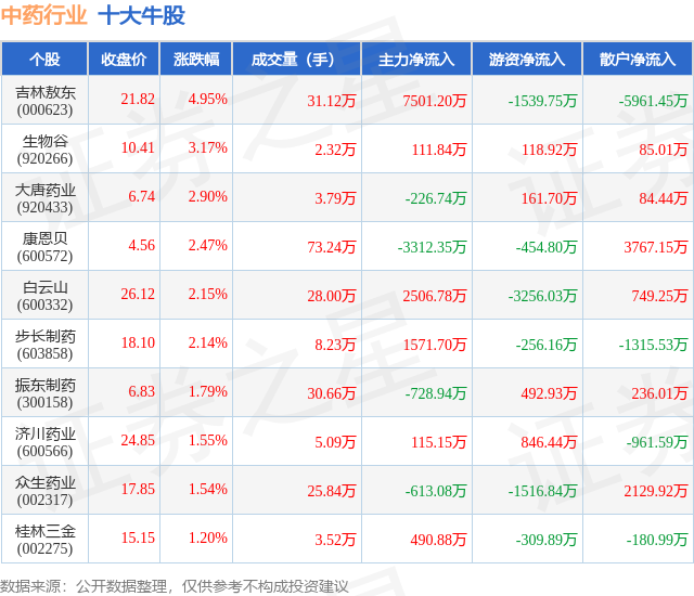 个股表现方面,中药行业当日领涨股为吉林敖东(000623),该股当日报收21.82,上涨4.95%,成交量31.12万,主力资金净流入7501.2万元。生物谷(920266)以上涨3.17%紧随其后,该股当日成交量2.32万,主力资金净流入111.84万元。除此之外,大唐药业(920433)、康恩贝(600572)、白云山(600332)均进入当日牛股之列。具体个股列表见下表: