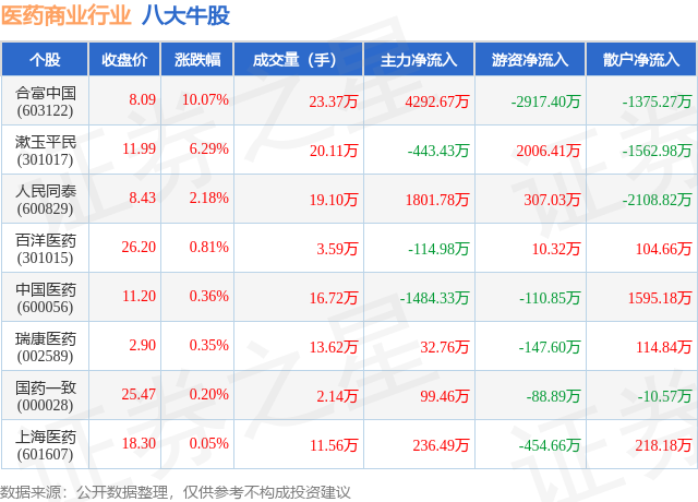 个股表现方面,医药商业行业当日领涨股为合富中国(603122),该股当日报收8.09,上涨10.07%,成交量23.37万,主力资金净流入4292.67万元。漱玉平民(301017)以上涨6.29%紧随其后,该股当日成交量20.11万,主力资金净流出443.43万元。除此之外,人民同泰(600829)、百洋医药(301015)、中国医药(600056)均进入当日牛股之列。具体个股列表见下表: