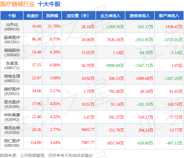 个股表现方面,医疗器械行业当日领涨股为山外山(688410),该股当日报收16.6,上涨11.78%,成交量28.18万,主力资金净流出1369.3万元。振德医疗(603301)以上涨6.71%紧随其后,该股当日成交量20.0万,主力资金净流入7636.1万元。除此之外,福瑞股份(300049)、东富龙(300171)、微电生理(688351)均进入当日牛股之列。具体个股列表见下表: