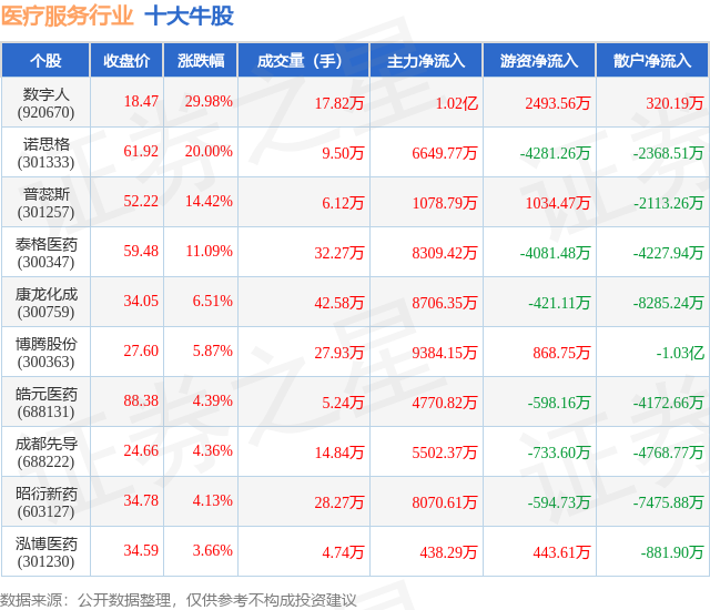 个股表现方面,医疗服务行业当日领涨股为数字人(920670),该股当日报收18.47,上涨29.98%,成交量17.82万,主力资金净流入1.02亿元。诺思格(301333)以上涨20.0%紧随其后,该股当日成交量9.5万,主力资金净流入6649.77万元。除此之外,普蕊斯(301257)、泰格医药(300347)、康龙化成(300759)均进入当日牛股之列。具体个股列表见下表: