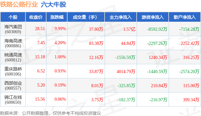 个股表现方面,铁路公路行业当日领涨股为海汽集团(603069),该股当日报收28.51,上涨9.99%,成交量37.8万,主力资金净流入1.57亿元。海南高速(000886)以上涨4.2%紧随其后,该股当日成交量83.38万,主力资金净流入44.84万元。除此之外,皖通高速(600012)、重庆路桥(600106)、西部创业(000557)均进入当日牛股之列。具体个股列表见下表: