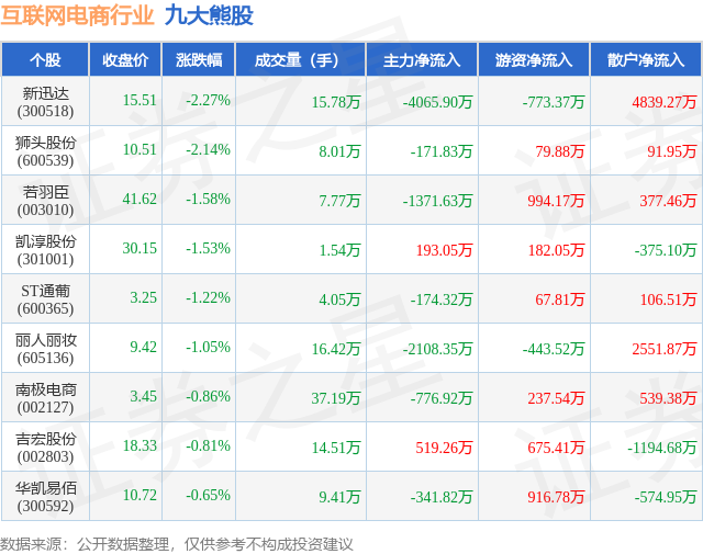 个股表现方面,互联网电商行业当日领跌股为新迅达(300518),该股当日报收15.51,下跌2.27%,成交量15.78万,主力资金净流出4065.9万元。狮头股份(600539)以下跌2.14%紧随其后,该股当日成交量8.01万,主力资金净流出171.83万元。除此之外,若羽臣(003010)、凯淳股份(301001)、ST通葡(600365)均进入当日熊股之列。具体个股列表见下表: