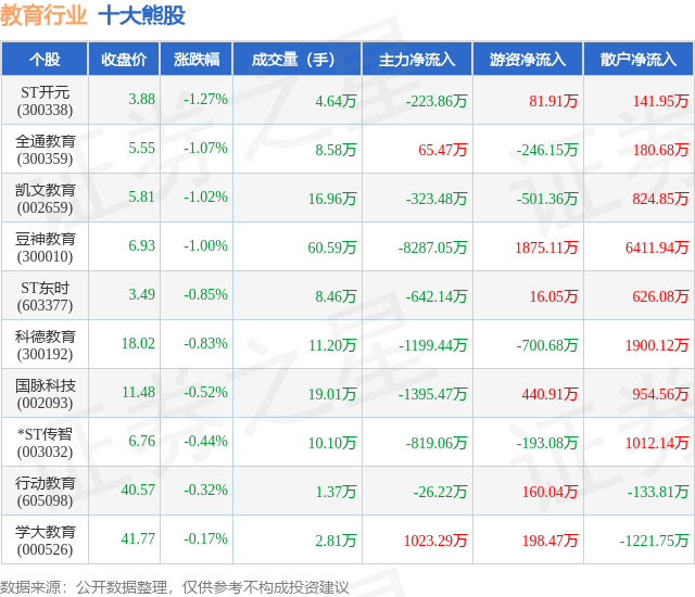 个股表现方面,教育行业当日领跌股为ST开元(300338),该股当日报收3.88,下跌1.27%,成交量4.64万,主力资金净流出223.86万元。全通教育(300359)以下跌1.07%紧随其后,该股当日成交量8.58万,主力资金净流入65.47万元。除此之外,凯文教育(002659)、豆神教育(300010)、ST东时(603377)均进入当日熊股之列。具体个股列表见下表: