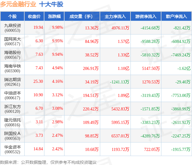 个股表现方面,多元金融行业当日领涨股为九鼎投资(600053),该股当日报收19.94,上涨9.98%,成交量13.36万,主力资金净流入4976.11万元。国网英大(600517)以上涨9.95%紧随其后,该股当日成交量84.96万,主力资金净流入1.57亿元。除此之外,海德股份(000567)、海南华铁(603300)、瑞达期货(002961)均进入当日牛股之列。具体个股列表见下表: