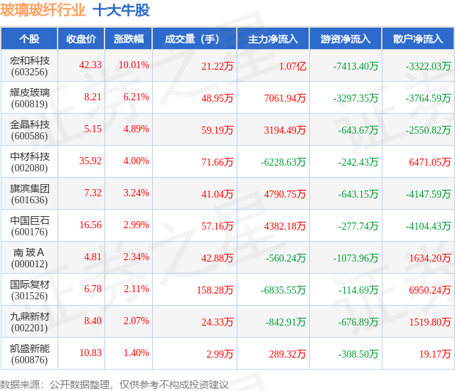 个股表现方面,玻璃玻纤行业当日领涨股为宏和科技(603256),该股当日报收42.33,上涨10.01%,成交量21.22万,主力资金净流入1.07亿元。耀皮玻璃(600819)以上涨6.21%紧随其后,该股当日成交量48.95万,主力资金净流入7061.94万元。除此之外,金晶科技(600586)、中材科技(002080)、旗滨集团(601636)均进入当日牛股之列。具体个股列表见下表: