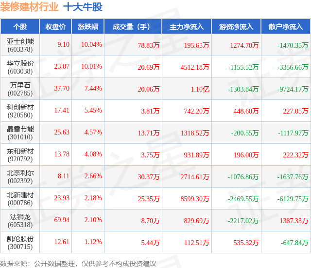 个股表现方面,装修建材行业当日领涨股为亚士创能(603378),该股当日报收9.1,上涨10.04%,成交量78.83万,主力资金净流入195.65万元。华立股份(603038)以上涨10.01%紧随其后,该股当日成交量20.69万,主力资金净流入4512.18万元。除此之外,万里石(002785)、科创新材(920580)、晶雪节能(301010)均进入当日牛股之列。具体个股列表见下表:
