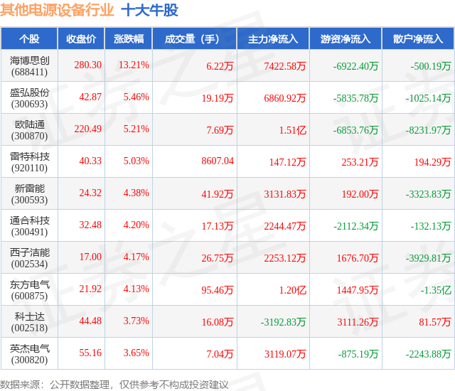 个股表现方面,其他电源设备行业当日领涨股为海博思创(688411),该股当日报收280.3,上涨13.21%,成交量6.22万,主力资金净流入7422.58万元。盛弘股份(300693)以上涨5.46%紧随其后,该股当日成交量19.19万,主力资金净流入6860.92万元。除此之外,欧陆通(300870)、雷特科技(920110)、新雷能(300593)均进入当日牛股之列。具体个股列表见下表: