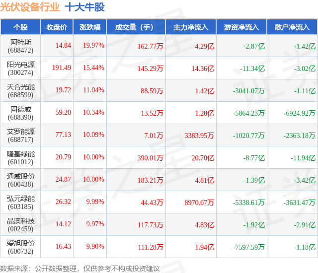 个股表现方面,光伏设备行业当日领涨股为阿特斯(688472),该股当日报收14.84,上涨19.97%,成交量162.77万,主力资金净流入4.29亿元。阳光电源(300274)以上涨15.44%紧随其后,该股当日成交量145.29万,主力资金净流入14.36亿元。除此之外,天合光能(688599)、固德威(688390)、艾罗能源(688717)均进入当日牛股之列。具体个股列表见下表: