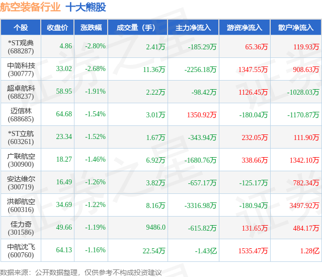 个股表现方面,航空装备行业当日领跌股为*ST观典(688287),该股当日报收4.86,下跌2.8%,成交量2.41万,主力资金净流出185.29万元。中简科技(300777)以下跌2.68%紧随其后,该股当日成交量11.36万,主力资金净流出2256.18万元。除此之外,超卓航科(688237)、迈信林(688685)、*ST立航(603261)均进入当日熊股之列。具体个股列表见下表: