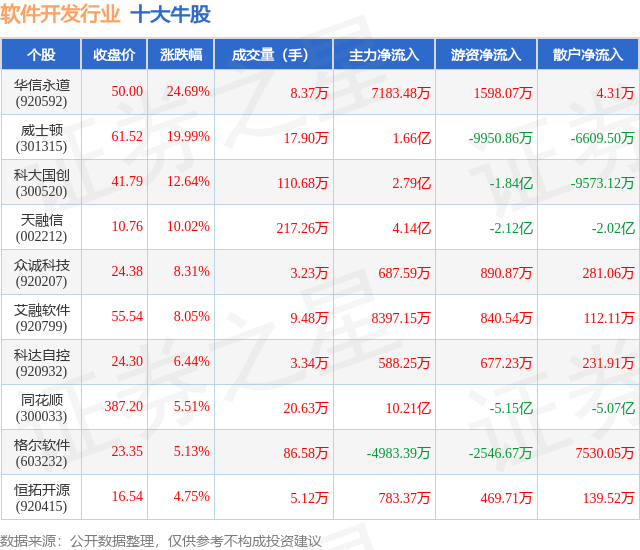 个股表现方面,软件开发行业当日领涨股为华信永道(920592),该股当日报收50.0,上涨24.69%,成交量8.37万,主力资金净流入7183.48万元。威士顿(301315)以上涨19.99%紧随其后,该股当日成交量17.9万,主力资金净流入1.66亿元。除此之外,科大国创(300520)、天融信(002212)、众诚科技(920207)均进入当日牛股之列。具体个股列表见下表: