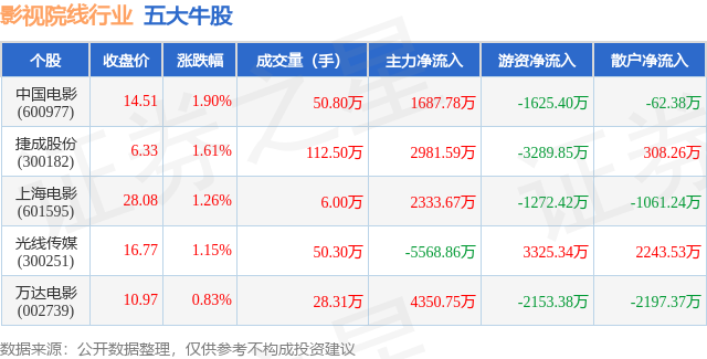 个股表现方面,影视院线行业当日领涨股为中国电影(600977),该股当日报收14.51,上涨1.9%,成交量50.8万,主力资金净流入1687.78万元。捷成股份(300182)以上涨1.61%紧随其后,该股当日成交量112.5万,主力资金净流入2981.59万元。除此之外,上海电影(601595)、光线传媒(300251)、万达电影(002739)均进入当日牛股之列。具体个股列表见下表: