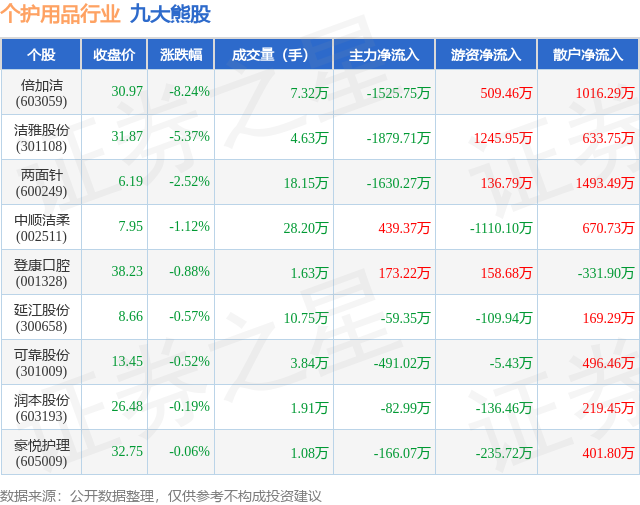 个股表现方面,个护用品行业当日领跌股为倍加洁(603059),该股当日报收30.97,下跌8.24%,成交量7.32万,主力资金净流出1525.75万元。洁雅股份(301108)以下跌5.37%紧随其后,该股当日成交量4.63万,主力资金净流出1879.71万元。除此之外,两面针(600249)、中顺洁柔(002511)、登康口腔(001328)均进入当日熊股之列。具体个股列表见下表: