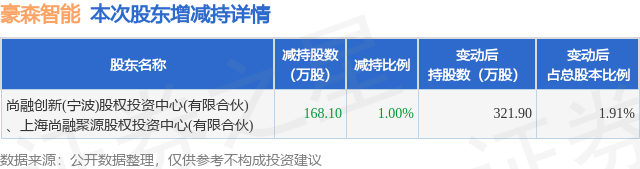 证券之星消息,10月29日豪森智能发布公告《豪森智能:豪森智能5%以下股东减持计划期限届满暨减持股份结果公告》,其股东尚融创新(宁波)股权投资中心(有限合伙)、上海尚融聚源股权投资中心(有限合伙)于2025年7月30日至2025年10月29日间合计减持168.1万股,占公司目前总股本的0.9996%,变动期间该股股价下跌6.14%,截止10月29日收盘报19.26元。