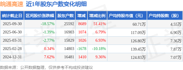 从股价来看,2025年6月30日至2025年9月30日,皖通高速区间跌幅为18.57%,在此期间股东户数增加8689.0户,增幅为51.41%。