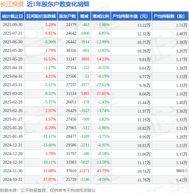 从股价来看,2025年7月31日至2025年9月30日,长江投资区间涨幅为5.29%,在此期间股东户数减少463.0户,减幅为1.88%。