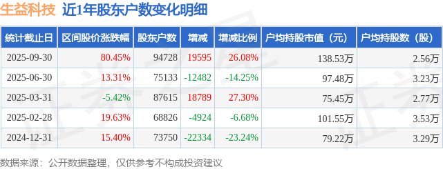 证券之星消息,近日生益科技披露,截至2025年9月30日公司股东户数为9.47万户,较6月30日增加1.96万户,增幅为26.08%。户均持股数量由上期的3.23万股减少至2.56万股,户均持股市值为138.53万元。