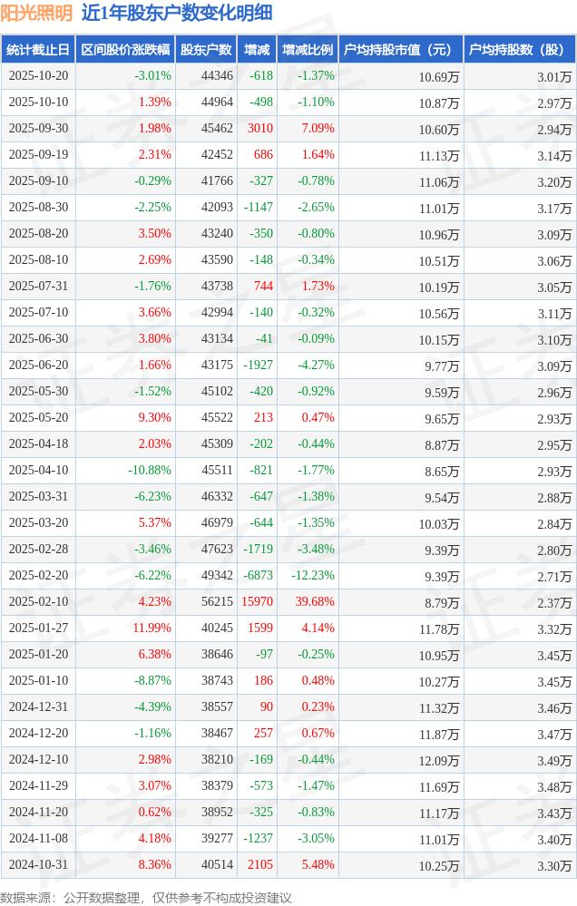 从股价来看,2025年10月10日至2025年10月20日,阳光照明区间跌幅为3.01%,在此期间股东户数减少618.0户,减幅为1.37%。