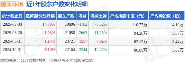 从股价来看,2025年6月30日至2025年9月30日,瀚蓝环境区间涨幅为14.78%,在此期间股东户数减少1162.0户,减幅为5.52%。