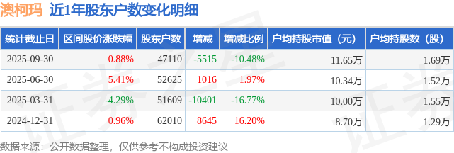 从股价来看,2025年6月30日至2025年9月30日,澳柯玛区间涨幅为0.88%,在此期间股东户数减少5515.0户,减幅为10.48%。