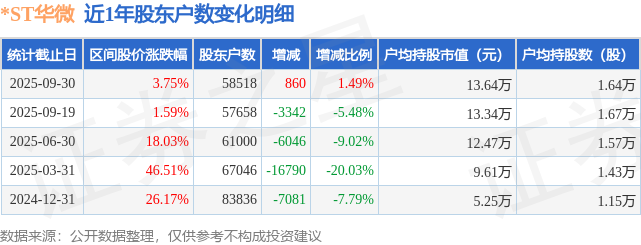 从股价来看,2025年9月19日至2025年9月30日,*ST华微区间涨幅为3.75%,在此期间股东户数增加860.0户,增幅为1.49%。