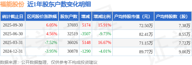从股价来看,2025年6月30日至2025年9月30日,福能股份区间涨幅为6.05%,在此期间股东户数增加5174.0户,增幅为15.91%。