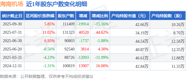 从股价来看,2025年7月31日至2025年9月30日,海南机场区间涨幅为5.85%,在此期间股东户数减少1.99万户,减幅为15.16%。
