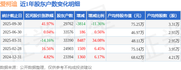 从股价来看,2025年6月30日至2025年9月30日,爱柯迪区间涨幅为41.97%,在此期间股东户数减少3814.0户,减幅为11.36%。