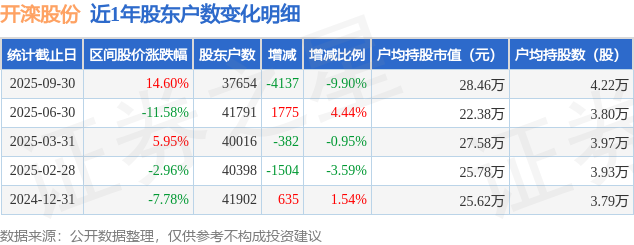 从股价来看,2025年6月30日至2025年9月30日,开滦股份区间涨幅为14.6%,在此期间股东户数减少4137.0户,减幅为9.9%。