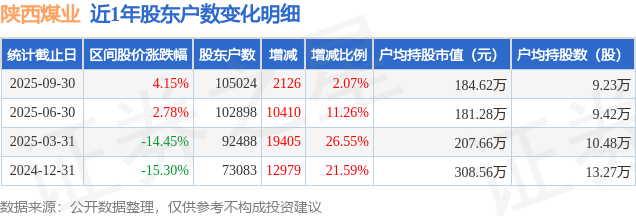 从股价来看,2025年6月30日至2025年9月30日,陕西煤业区间涨幅为4.15%,在此期间股东户数增加2126.0户,增幅为2.07%。