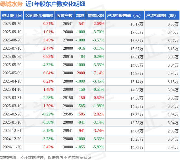 从股价来看,2025年9月19日至2025年9月30日,绿城水务区间涨幅为0.21%,在此期间股东户数增加541.0户,增幅为2.08%。