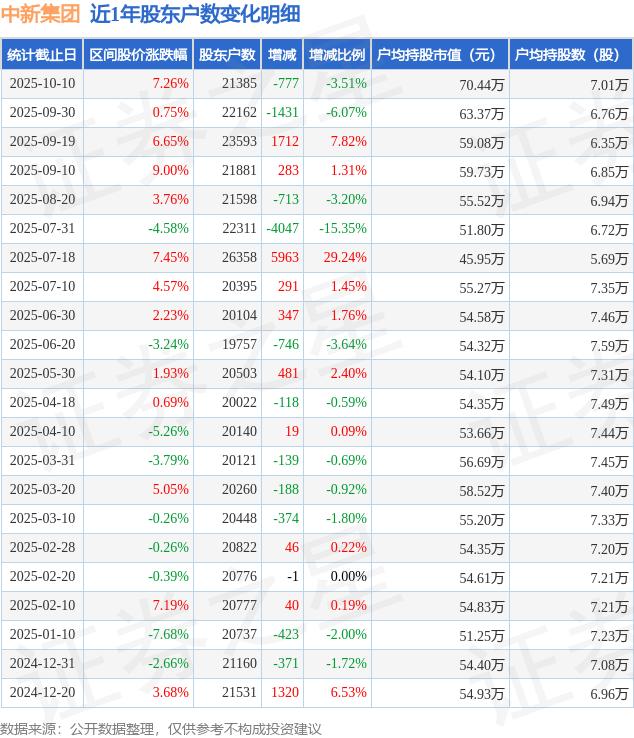 从股价来看,2025年9月30日至2025年10月10日,中新集团区间涨幅为7.26%,在此期间股东户数减少777.0户,减幅为3.51%。