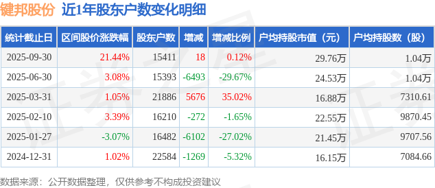从股价来看,2025年6月30日至2025年9月30日,键邦股份区间涨幅为21.44%,在此期间股东户数增加18.0户,增幅为0.12%。