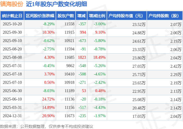 从股价来看,2025年9月30日至2025年10月20日,镇海股份区间跌幅为8.29%,在此期间股东户数减少357.0户,减幅为3.0%。