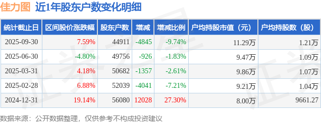 从股价来看,2025年6月30日至2025年9月30日,佳力图区间涨幅为7.59%,在此期间股东户数减少4845.0户,减幅为9.74%。
