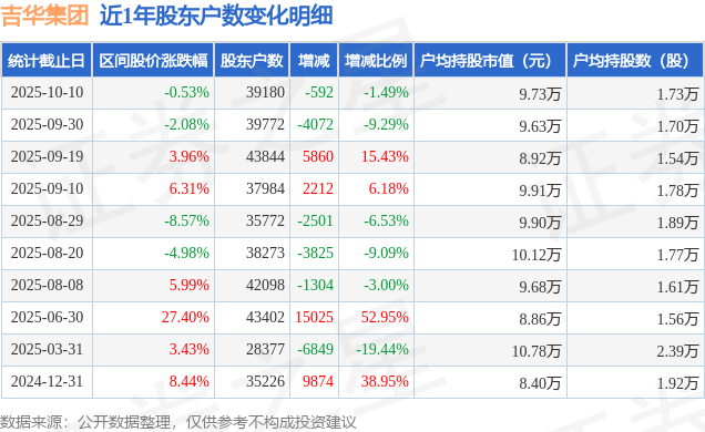 证券之星消息,近日吉华集团披露,截至2025年10月10日公司股东户数为3.92万户,较9月30日减少592.0户,减幅为1.49%。户均持股数量由上期的1.7万股增加至1.73万股,户均持股市值为9.73万元。