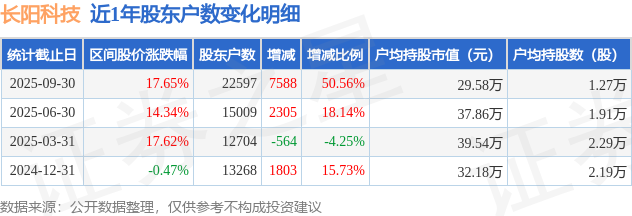 从股价来看,2025年6月30日至2025年9月30日,长阳科技区间涨幅为17.65%,在此期间股东户数增加7588.0户,增幅为50.56%。