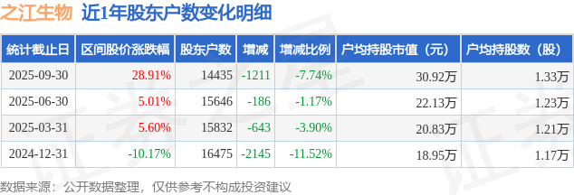 从股价来看,2025年6月30日至2025年9月30日,之江生物区间涨幅为28.91%,在此期间股东户数减少1211.0户,减幅为7.74%。
