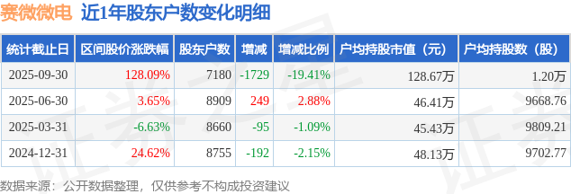 从股价来看,2025年6月30日至2025年9月30日,赛微微电区间涨幅为128.09%,在此期间股东户数减少1729.0户,减幅为19.41%。