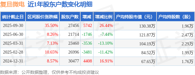 从股价来看,2025年6月30日至2025年9月30日,复旦微电区间涨幅为35.5%,在此期间股东户数增加5742.0户,增幅为26.44%。