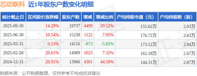 从股价来看,2025年6月30日至2025年9月30日,芯动联科区间涨幅为14.29%,在此期间股东户数增加4499.0户,增幅为29.52%。