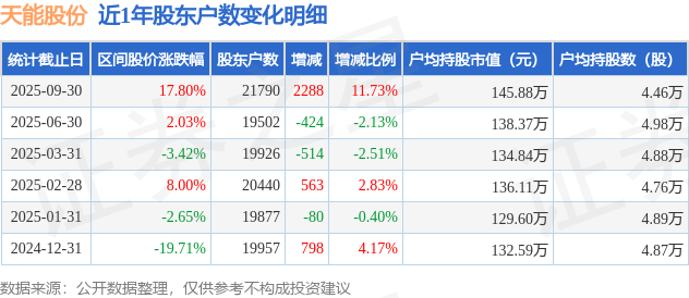 从股价来看,2025年6月30日至2025年9月30日,天能股份区间涨幅为17.8%,在此期间股东户数增加2288.0户,增幅为11.73%。