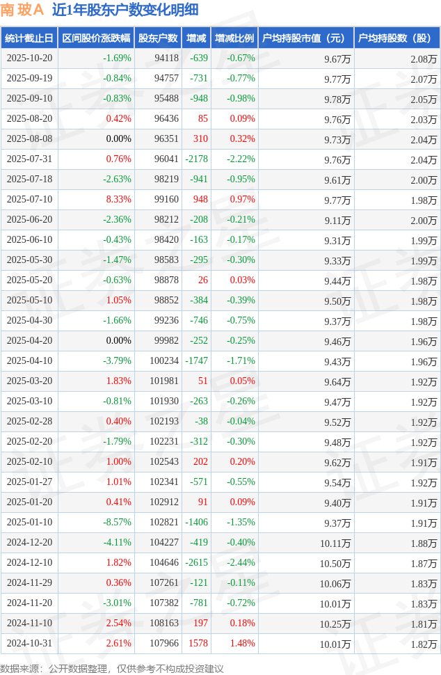 从股价来看,2025年9月19日至2025年10月20日,南 玻A区间跌幅为1.69%,在此期间股东户数减少639.0户,减幅为0.67%。