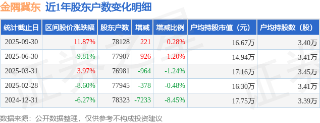 从股价来看,2025年6月30日至2025年9月30日,金隅冀东区间涨幅为11.87%,在此期间股东户数增加221.0户,增幅为0.28%。